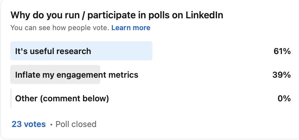 “Nearly two thirds of professionals say LinkedIn Polls are useful research” is another headline I could write from this poll.